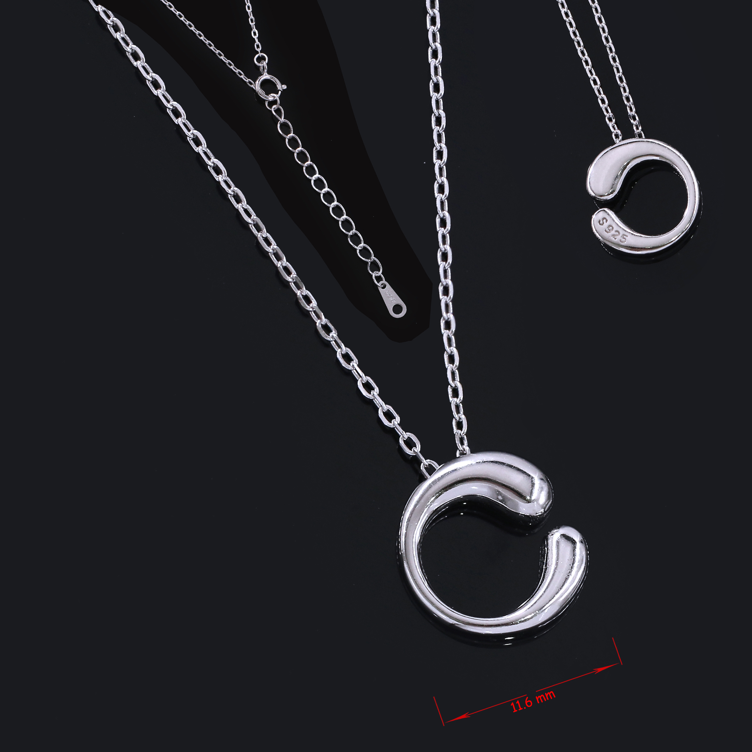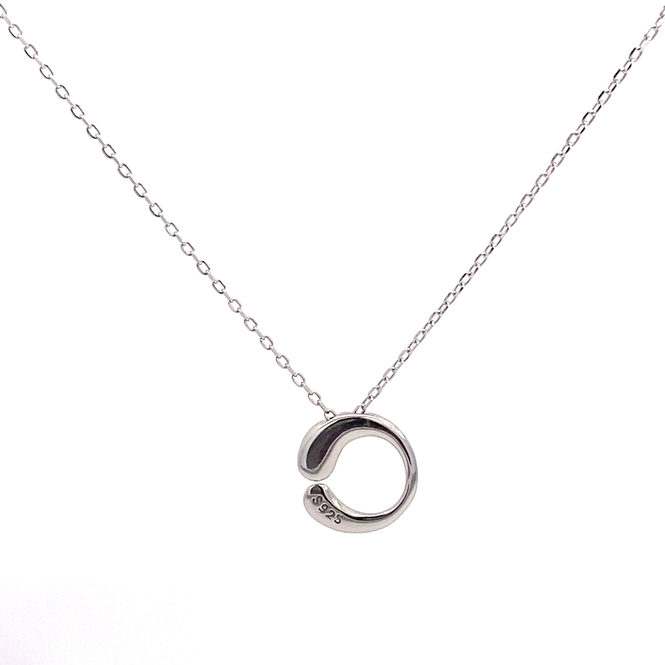 Make a bold yet sophisticated statement with this striking necklace featuring a uniquely designed open "C" pendant. Crafted from high-quality 925 sterling silver, this piece is finished with a durable rhodium plating, ensuring a brilliant shine and enhanced protection against tarnish.