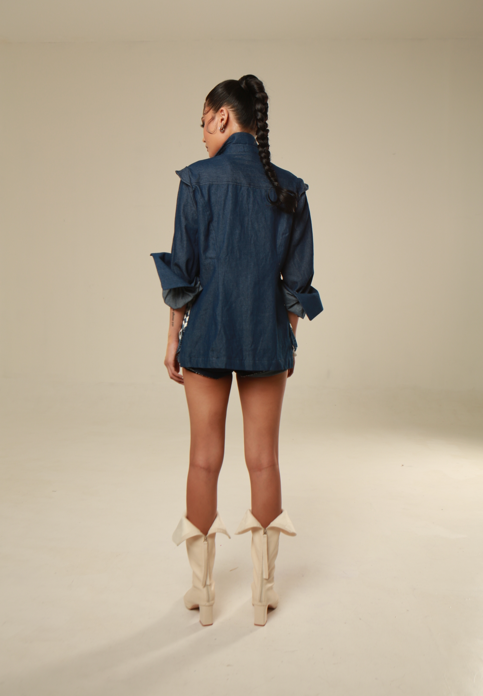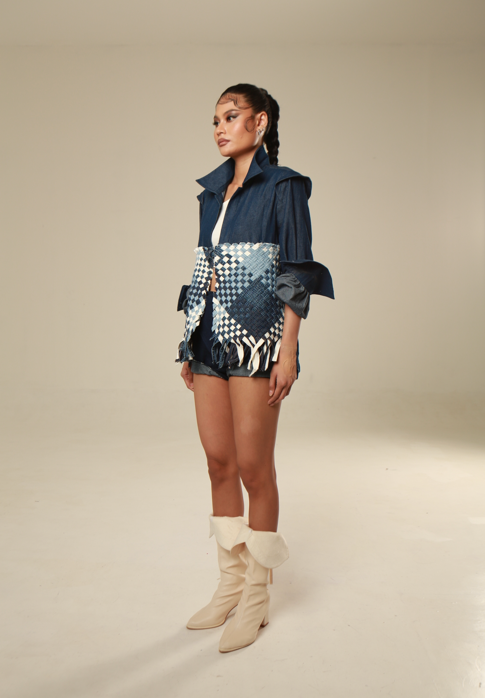 NISA HAMZAHNH/SS25/WJ1This denim top with handmade webbing is symbolic of West Java Traditional House, Indonesia. You can wear this shirt like an outter wear or you can button it and it could be a shirt.