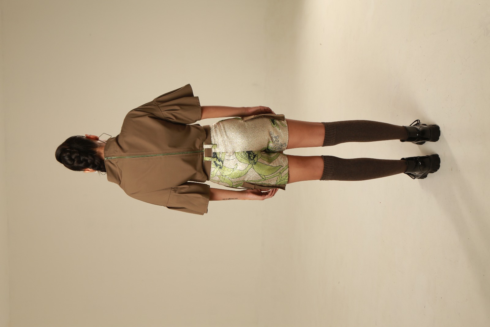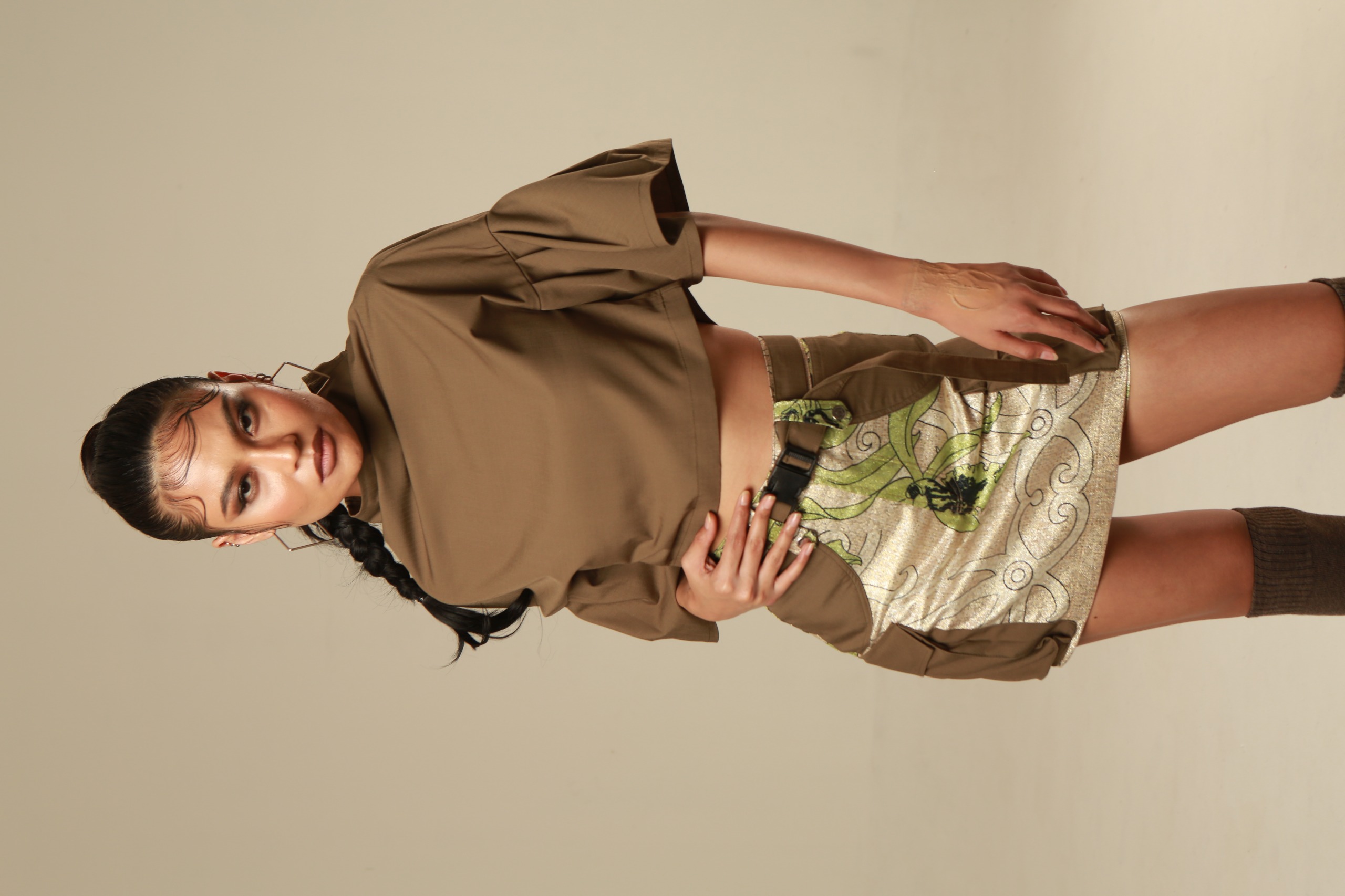 Bottom piece: a skort-style design featuring a skirt appearance at the front and shorts at the back, made from a combination of ripstop and jacquard fabrics to stay trendy, complete with flap cargo-style pockets for added functionality and edge.