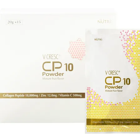 NUTRI V CRESC CP10 contains 10,000mg(10g) of collagen dipeptides along with 12 types of vitamins and minerals. One bottle per day is sufficient to meet the daily vitamin and mineral requirements for adults. Its rich 10,000mg(10g) of collagen dipeptides, 500 mg of vitamin C, and 12 mg of zinc can assist with skin cell repair and are used in Japan as nutritional management of pressure ulcers. CP10 is the first food to obtain labelling certificate as "usable for dietary management for pressure ulcer patients”, it is still the only one who has this certificate in Japan.