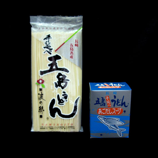 Shown here is a Nagasaki handmade udon set with a pack of udon and seasoning. The seasoning is made with flying fish, which flaunts a unique flavor. You can make your own flying fish soup with the powdered seasoning.