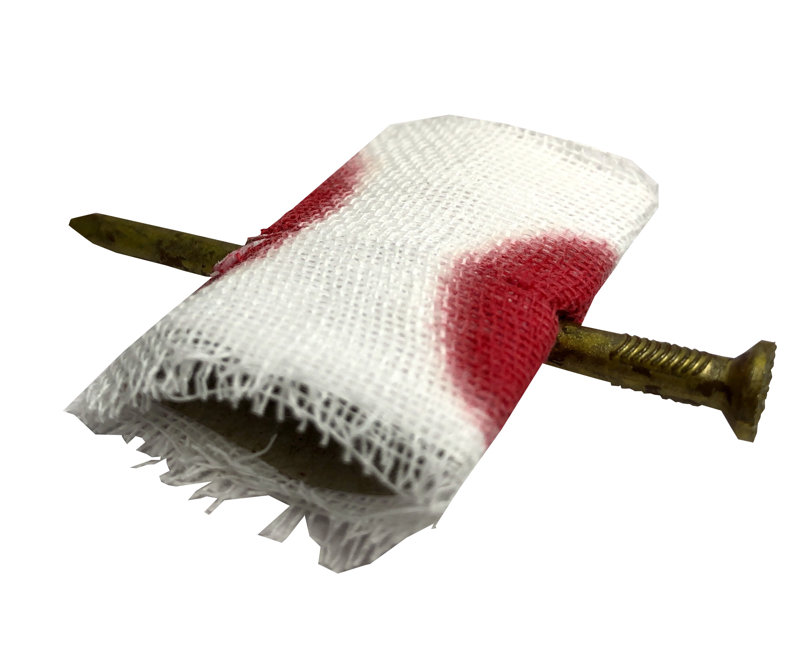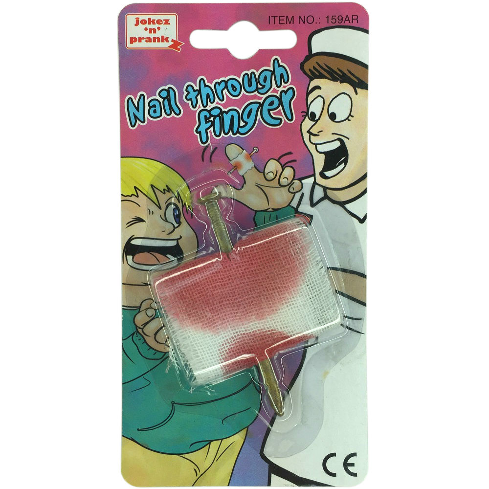 Play jokes on your friends with this false nail through finger gauze. It features a bandage with fake blood and has a nail that appears to be pass through the bandage. This prank toy is easy to put on your finger and is great for April Fools' Day, parties, carnivals, Halloween, costume parties and so on.