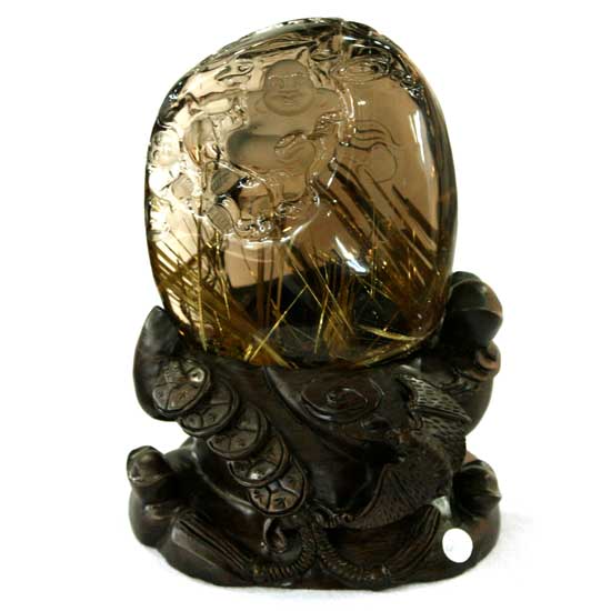 This handmade natural crystal artwork fully expresses a touch of Oriental culture. The crystal embellishment is crafted with a smiling Buddha that symbolizes happiness and fortune. Its base also features a lively Chinese bat and exquisite copper coins.
