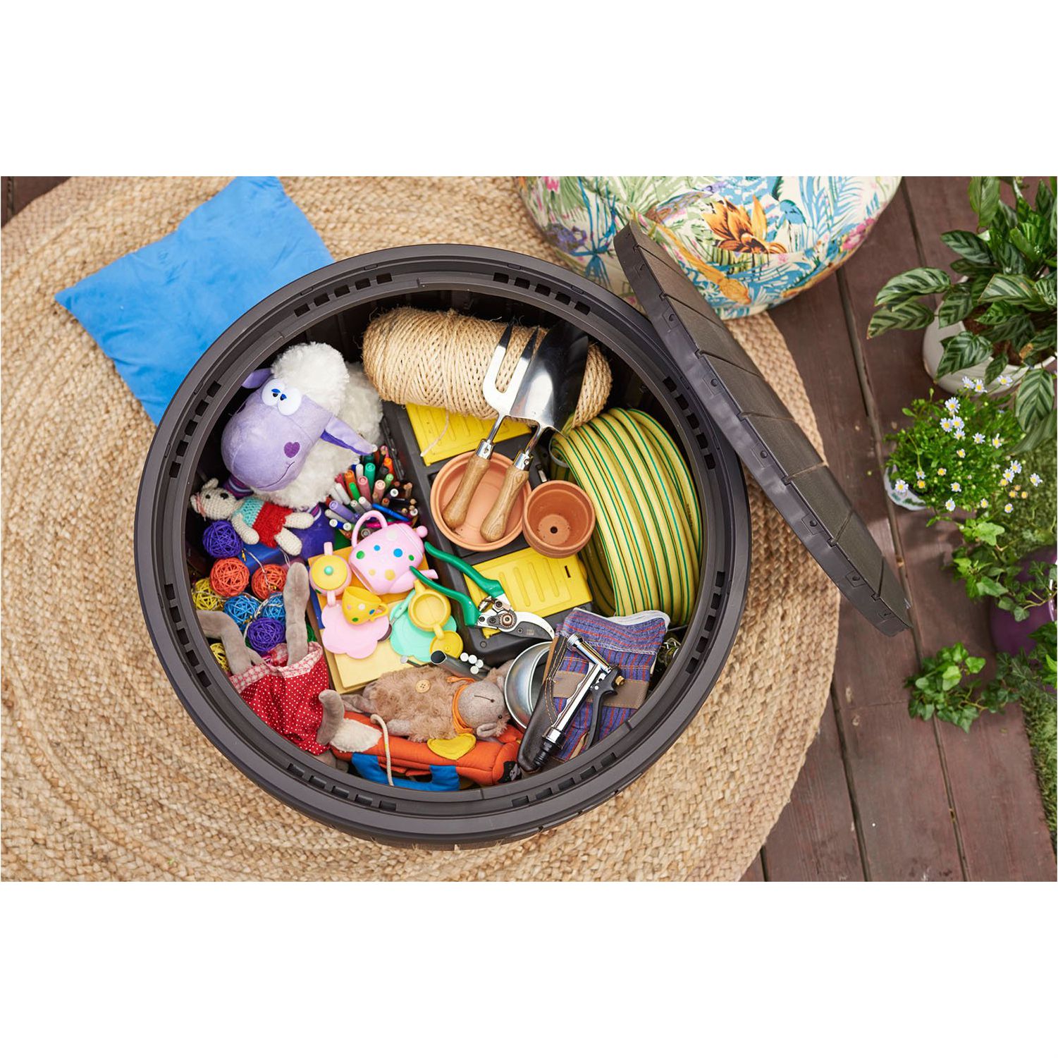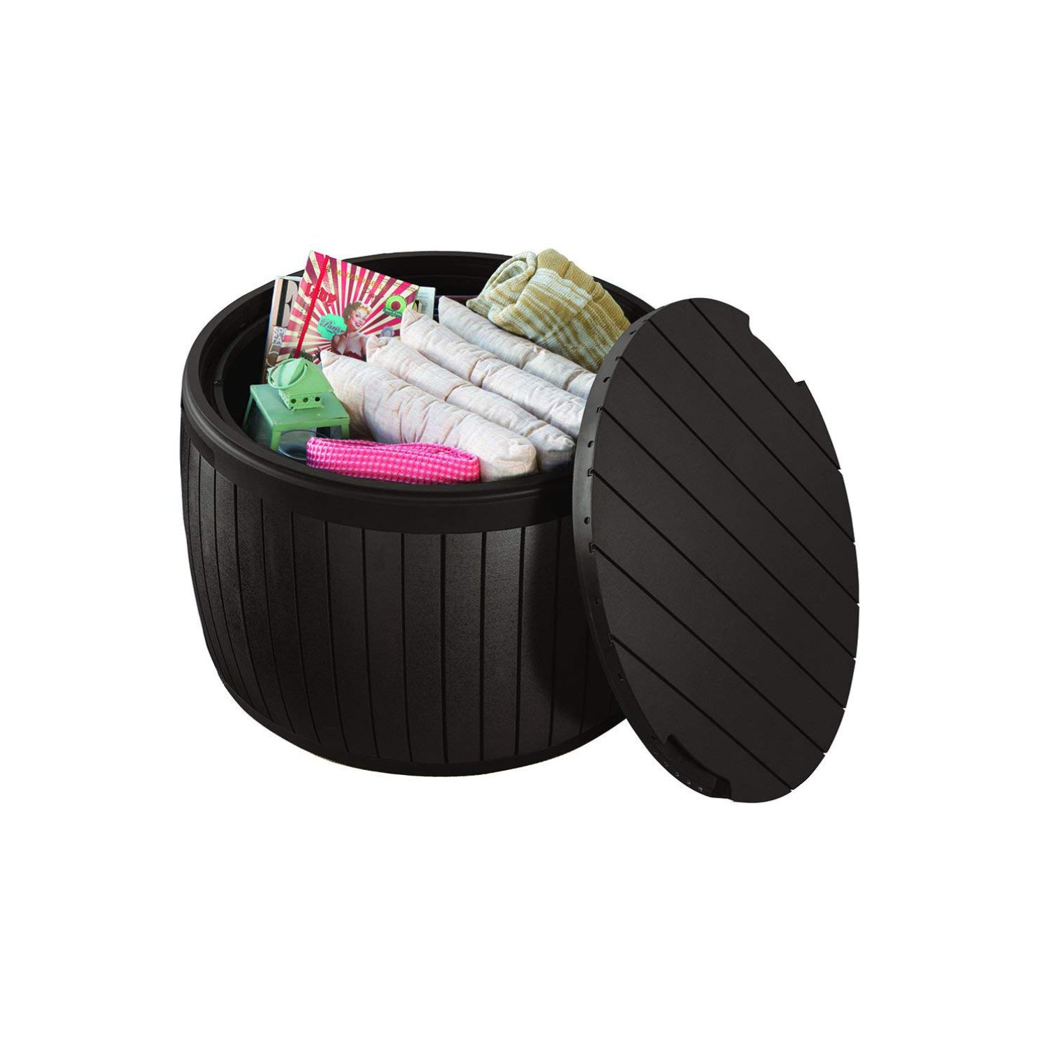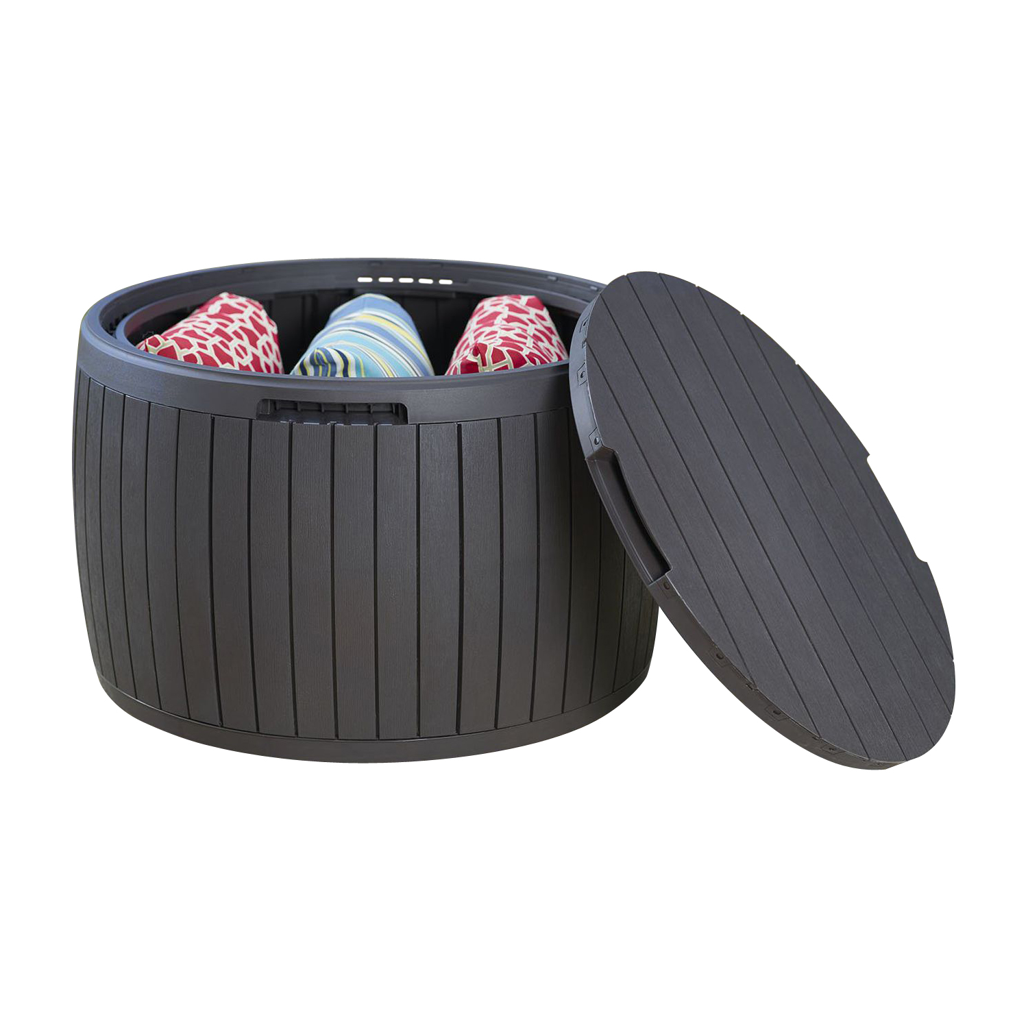External dimensions: 26.7 in. diameter x 16.5 H in. / Internal dimensions: 23.5 in. diameter x 15.7 in. Top of deck box: 24.4 W x 26.4 D inches