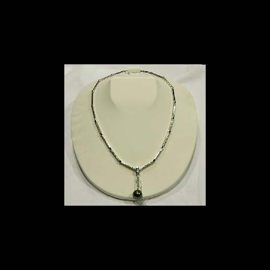 The necklace is embellished with an opaque round Tahitian black pearl