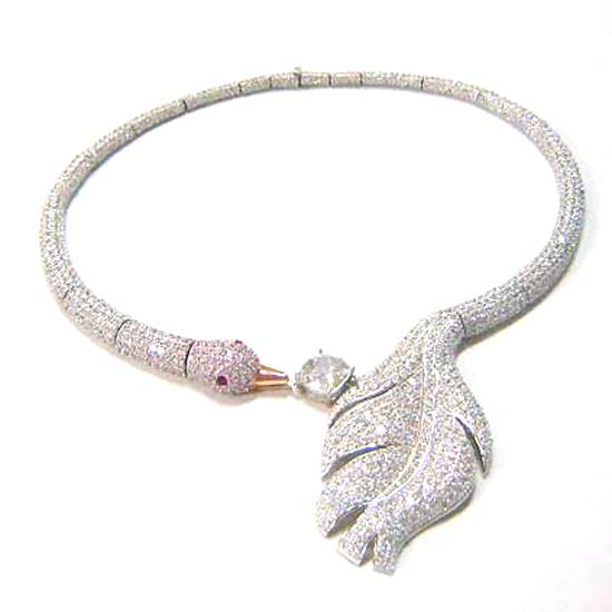 As shown is a necklace with a 4-prong fine diamond for connecting its head and tail. Other diamonds are pavé set to form the necklace body and the pendant. This necklace looks especially brilliant under light.
