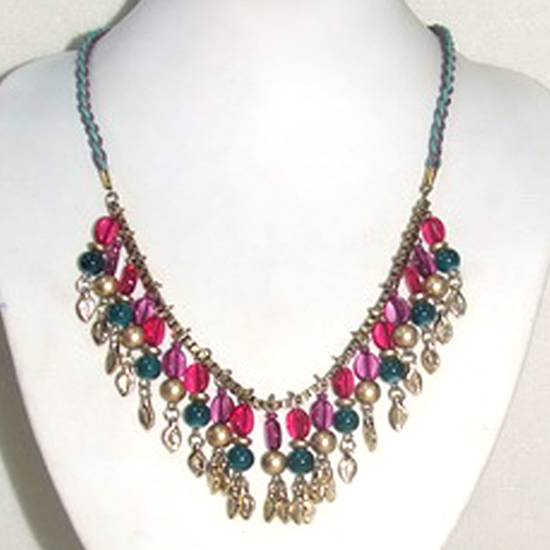 Featured is a necklace made with a braided chain and a metal chain. The necklace is made of different kinds of hanging beads in vivid colours.