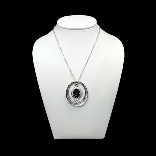 This is a dainty necklace and also a refined watch. It is made with high-quality silver in a round shape with a watch in the center. The sparkling stones add a charming and eye-catching touch to this piece.