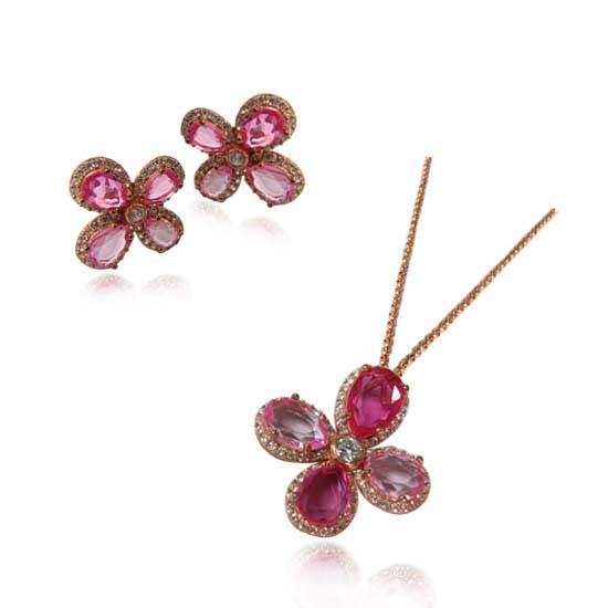 Featured here is a set of necklace and earrings in a lively flower design. The petals of the flower are finely crafted from multi-faceted pink stones and accented by tiny white stones. The jewelry set will surely add a feminine touch to any of your outfit.