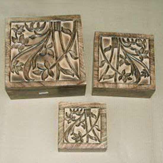 This nested box set includes three wooden boxes in square shapes. Each is adorned with beautifully carved floral patterns for a natural touch. The nested boxes are exquisite storage mediums.
