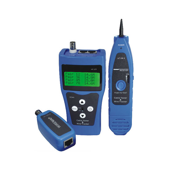 This is a network cable tester featuring a blue finish. It can verify RJ45, RJ11 and BNC cables. It is fitted with a backlit LCD screen for easy viewing.