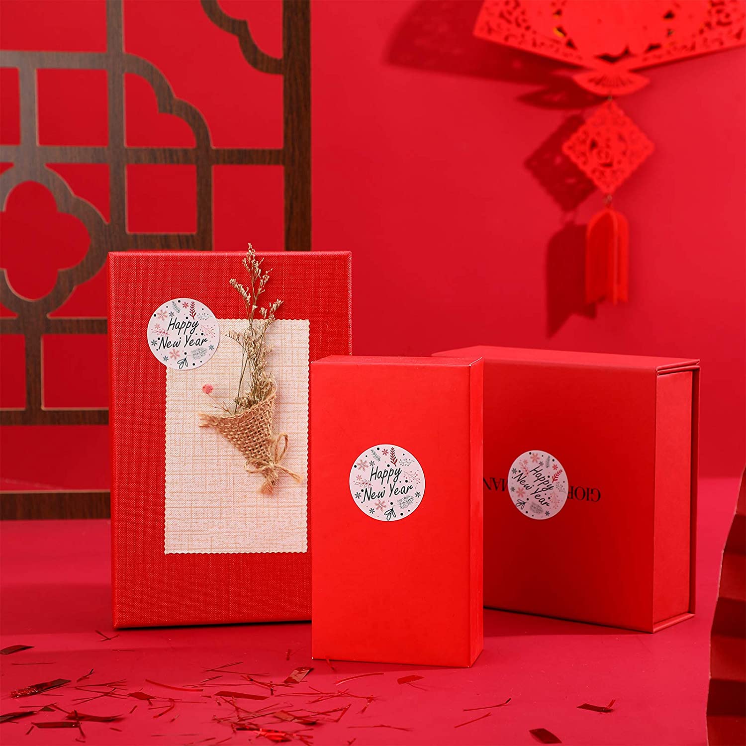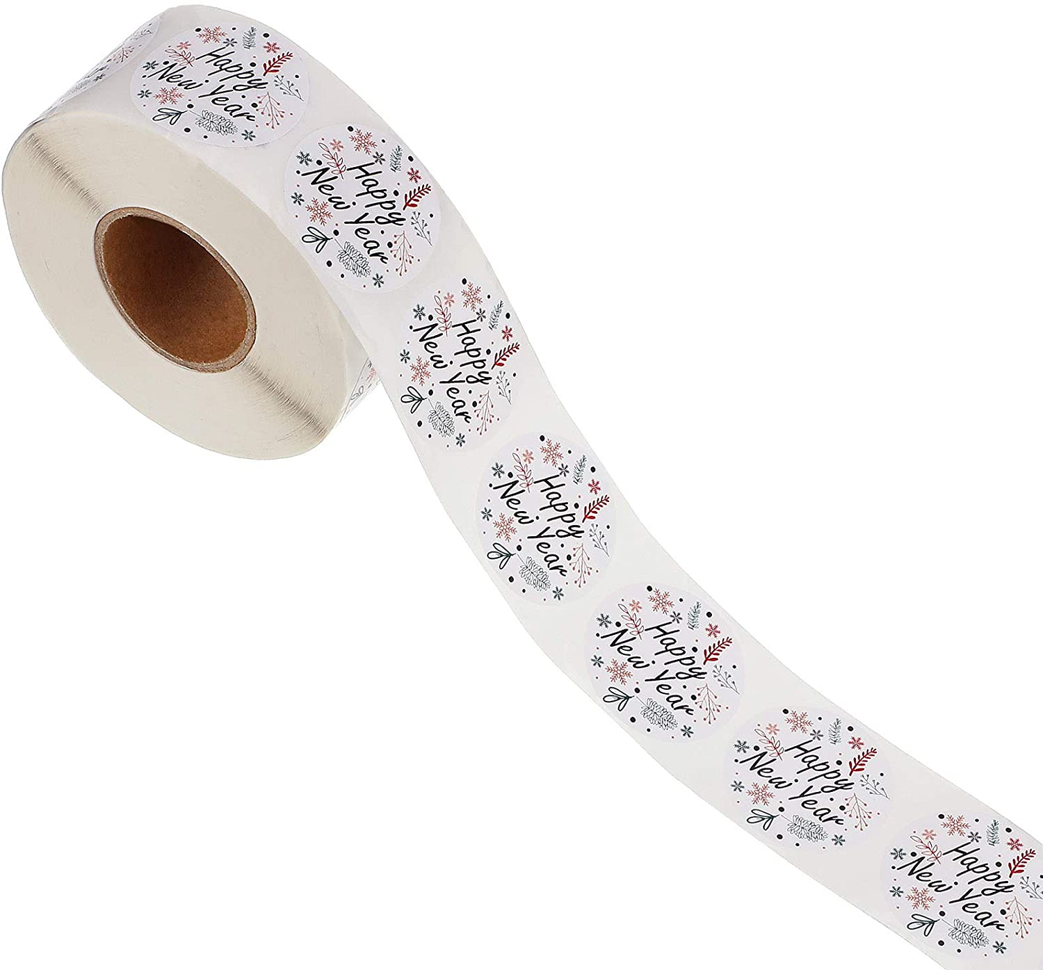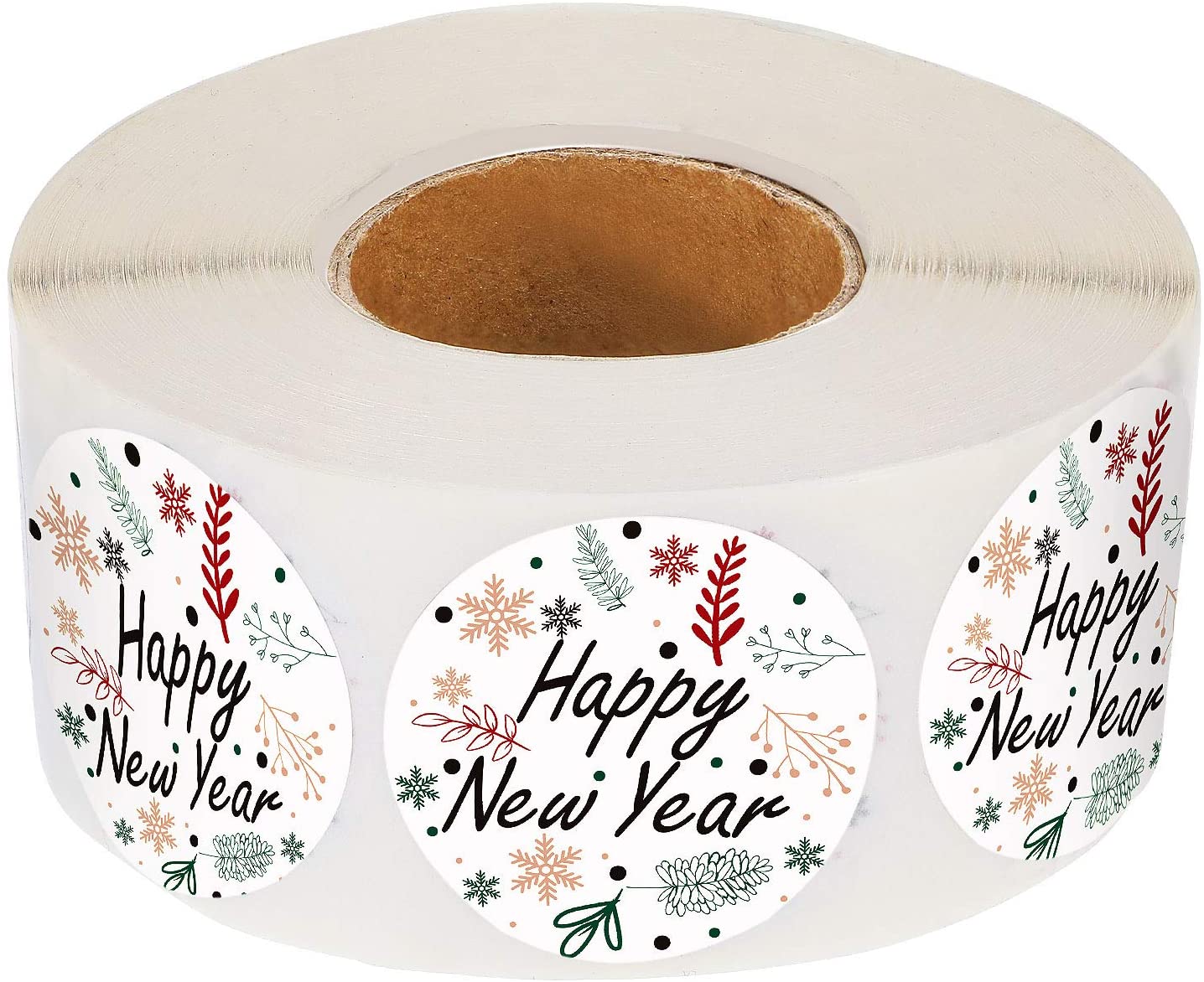- Each Happy New Year label features a permanent adhesive that sticks to paper, plastic, cardboard, bags, fabric and glass.