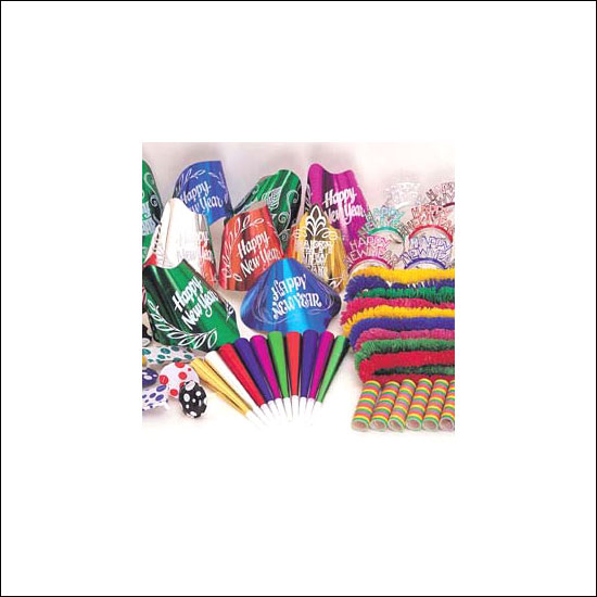Contains: 25 hats, 25 glittered tiaras, 50 noisemakers, 50 horns, 50 poly leis, 200 throws of serpentines