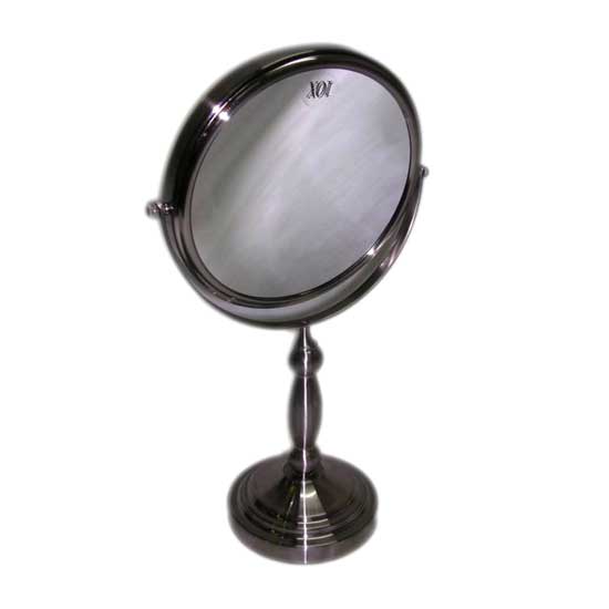 This is a desktop mirror coming with a curvy stand. The mirror frame and the stand are plated with nickel to give a shiny touch. The angle of the mirror can be adjusted for convenience.