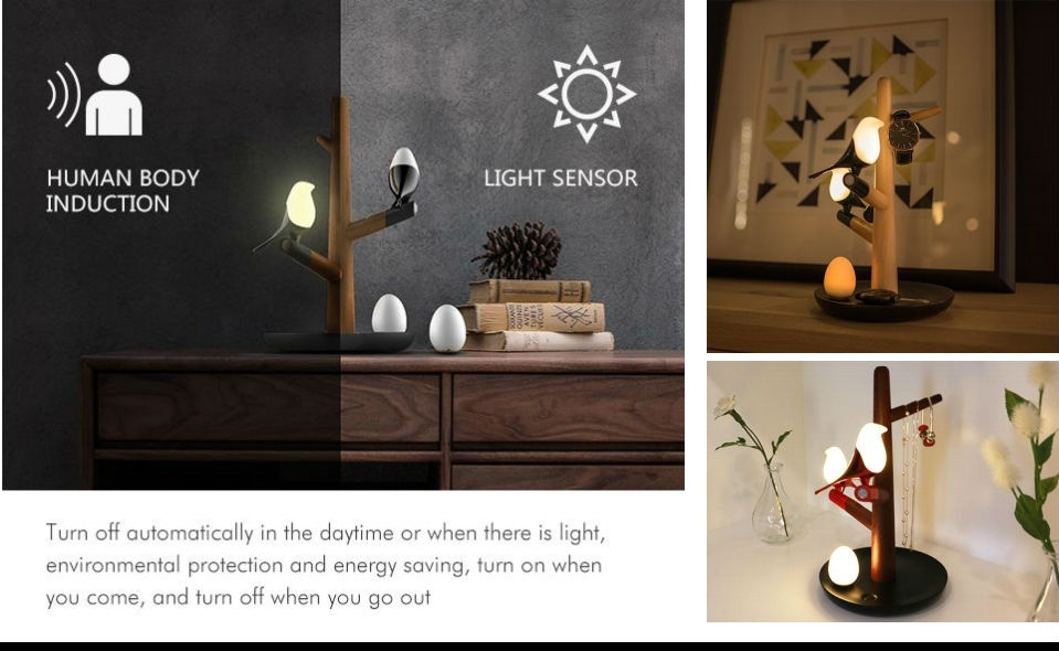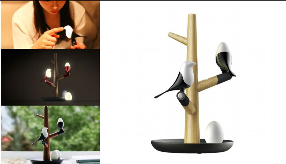 Highlighted here is a LED night light with a “birds on tree branches” design. The night light includes 2 detachable bird-shaped lights with an egg-shaped light and can be freely attached to the branches of the tree. This LED night light offers sensitive motion and touch sensing and delivers soothing light effects.