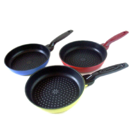 Pictured is a series of frying pans coated with a non-stick layer for efficient cooking. It is made with die-cast aluminum for enhanced durability. The PFOA-free diamond coating is the combined material of artificial diamond crystals with non-stick nano composites.