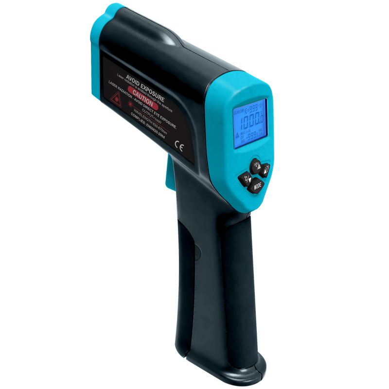 This thermometer is a hand-held, professional non-contact infrared thermometer. It is easy to use and features durable construction, high accuracy, wide measurement range, laser sighting, backlight, MAX/MIN/DIF/AVG temperature display, data hold, high and low alarm, adjustable emissivity, and automatic power-off.