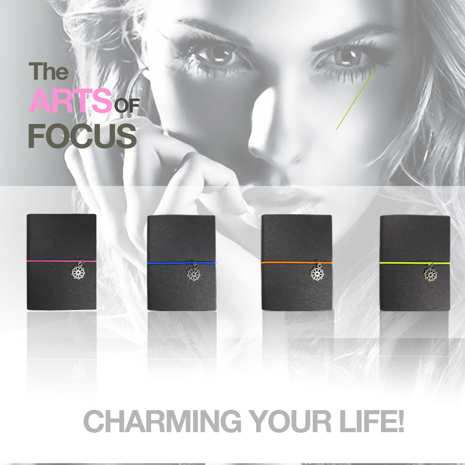 Featured here is a notebook in rectangular shape. It has a solid colored exterior and is adorned with a colored string. The artistic and charming notebook comes with a metal emblem attached to the string.