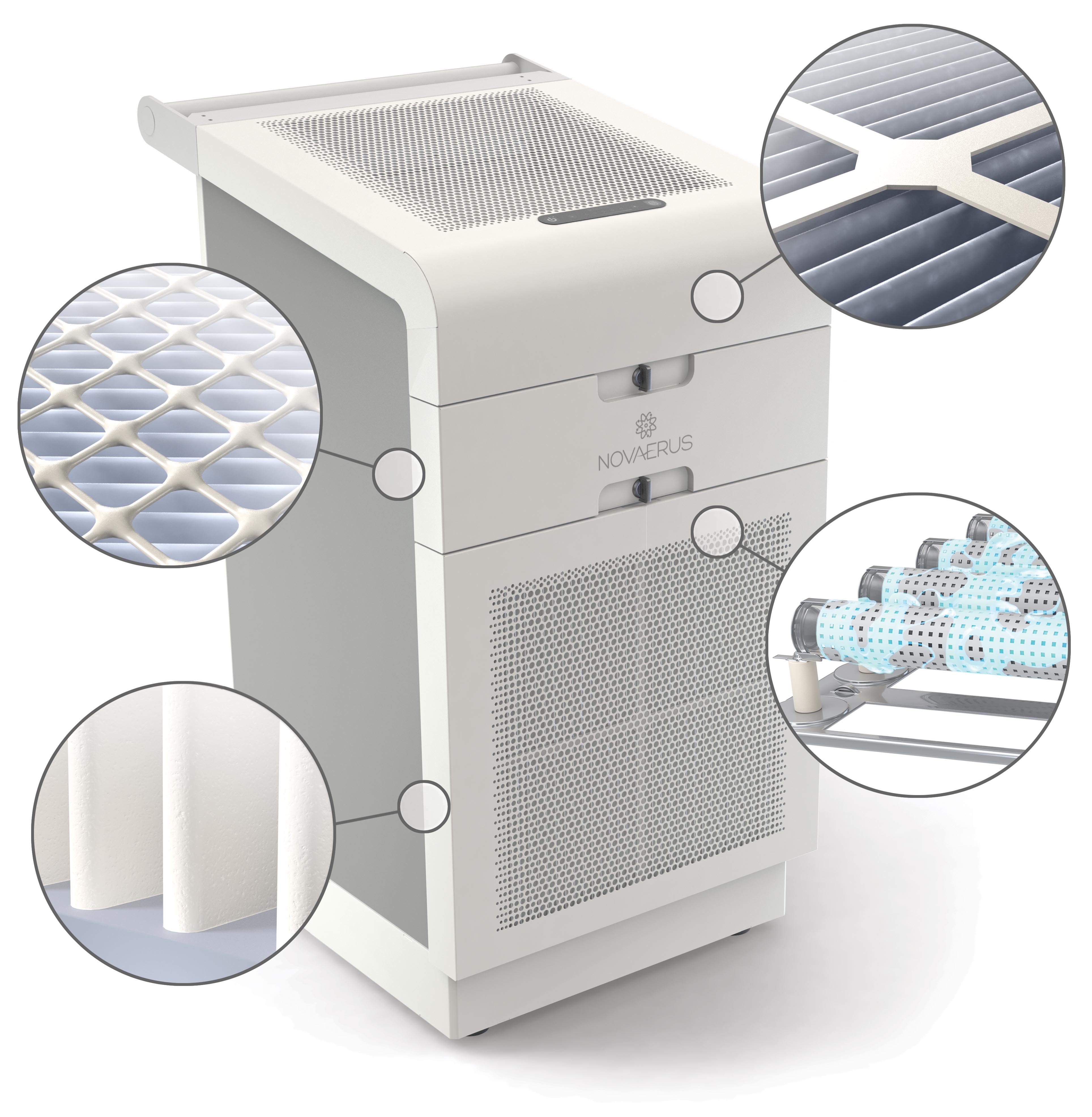 Patented active purification technology (atmospheric plasma discharge of the dielectric barrier discharge type) to continuously pull contaminated indoor air across internal short-exposure plasma coils, deactivating airborne microorganisms and viruses at the DNA level.