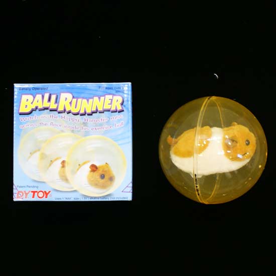 This novelty toy is called "Ball Runner". It features a battery-operated hamster figure that runs inside the ball. This cute animal toy is an ideal gift for children animal lovers.