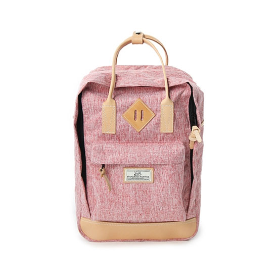 This is a backpack with a nylon body in red. The leather handles and accent add a touch of style to this design. This backpack is completed with a big main compartment and a zip back pocket.