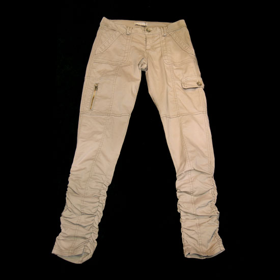 This pair of brown jeans features ruched details along the sides for offering a skinny fit. Left zipper pocket and right flapped pocket with a button construct an asymmetric beauty. This pair of jeans is great for relaxing at weekends.