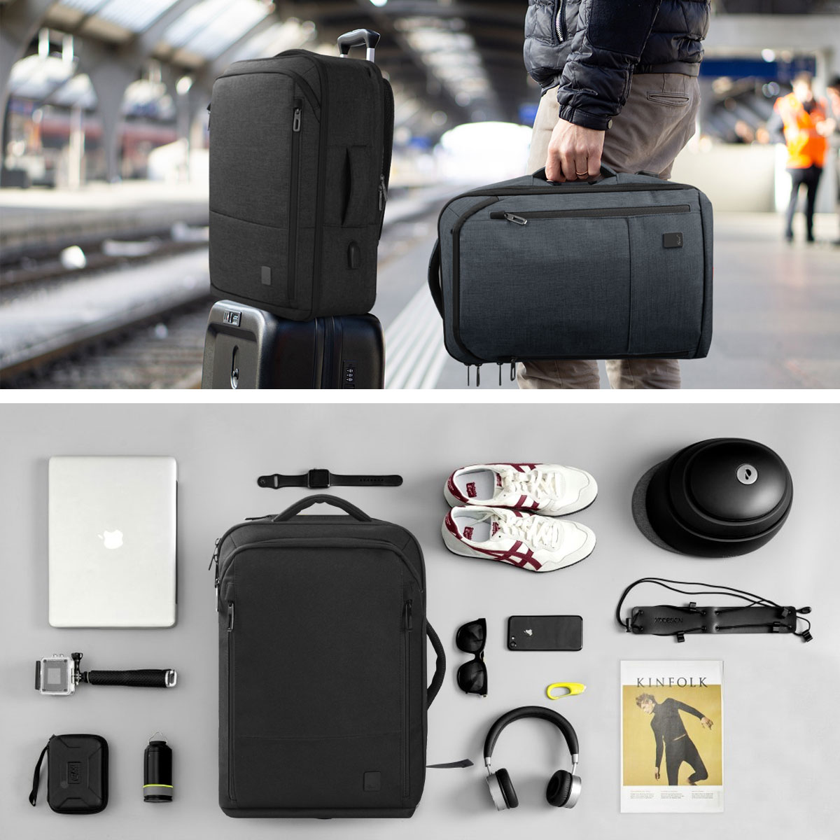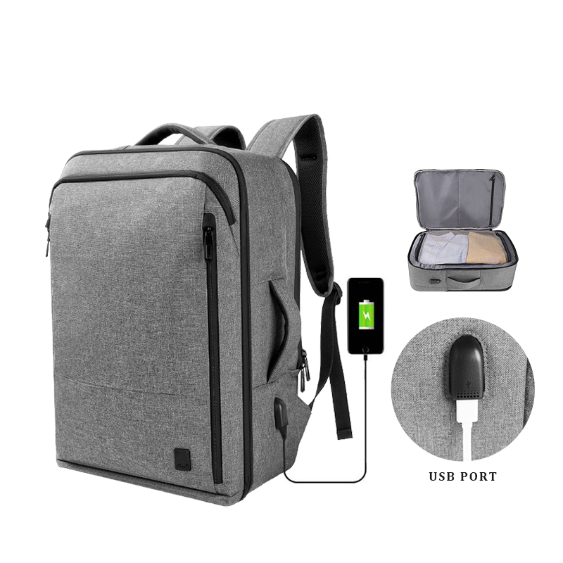 Presented in a large capacity, this backpack is able to hold 15.6-inch and 17.3-inch laptops. It is designed with the concept of a suitcase into a backpack, for business trips, traveling, or working. Featuring scientific storage, this backpack includes multi-pockets for better organization and storage. Made of new material fabric, this backpack is more durable insulation, and better waterproof. Besides, it has a USB port which is built into a charger outside, and a charging cable inside for easy charging.