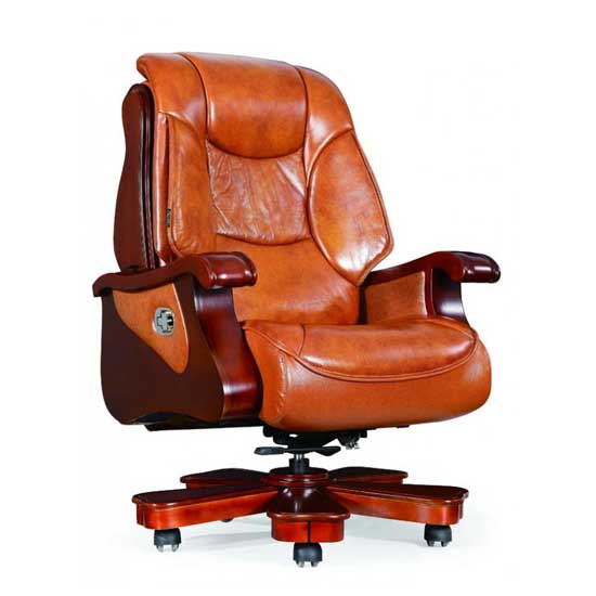 This comfy office chair features a light brown hue. It is well padded for exceptional comfort. It is designed with 5 wheels for easy maneuverability.