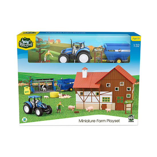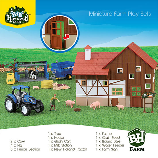 2 farm houses, 1 tractor, 1 grain cart, 2 cows, 4 pigs, 1 farmer, 1 round bale, 1 sack of rice, 1 tree, 1 farm sign