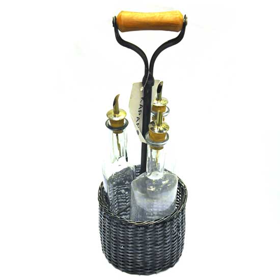This oil bottle set comes with a basket and 3 oil bottles. The metal pourer is carefully designed and made for maximum convenience. This set is an excellent tableware item for homes, restaurants, hotels and so on.