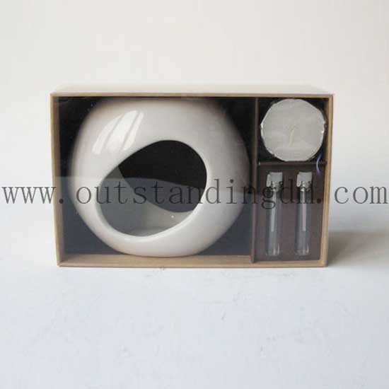 Showcased is an oil burner set featuring a dainty ball-shaped oil burner. The set also includes two bottles of aroma oil and a candle. Simple relax with this oil burner set.