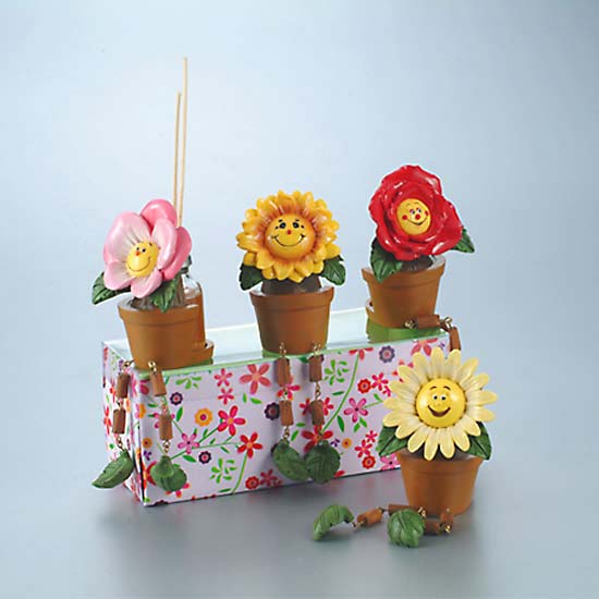 The oil diffuser features a flower pot figurine with a 20ml bottle for the fragrance oil. The wooden reeds are used to diffuse the fragrance into the air. Add an aromatic scent to the ambiance with this cheerful flower pot oil diffuser.