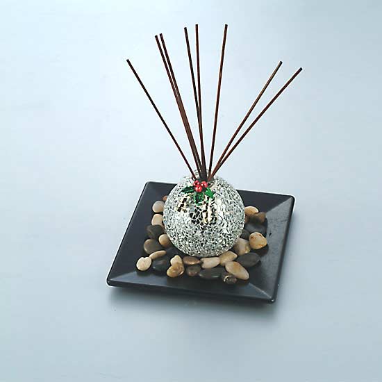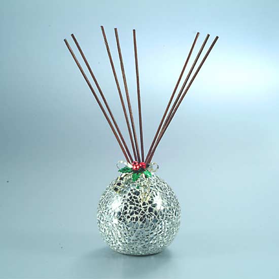 This is a reed diffuser featuring a ball-shaped bottle covered with shiny mosaic tiles, finished with a holly berry decoration. The wooden reeds diffuse the fragrance oil to add a pleasant tint in the air. This festive and gleaming reed diffuser makes a great decoration for the holiday season.