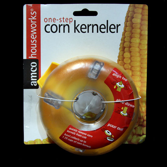 Outlined here is a doughnut-shaped kitchen utensil for removing kernels from corncobs. Simply align the corn cutter on the top of corn and slide down the utensil; it can quickly collect up to 1.25 cups of corn kernels. Enjoy fresh, sweet taste of corn at home with this one-step corn cutter.