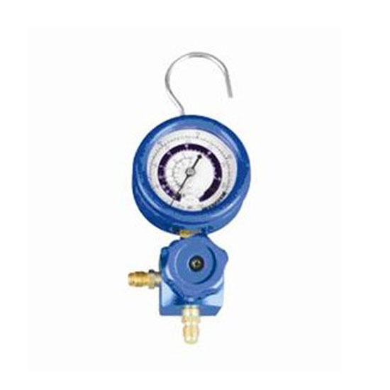 This one-valve manifold gauge set features a 1/4" SAE intake port. It is assembled with knobs that are easy to grip. It also comes with an anodized aluminum block body.
