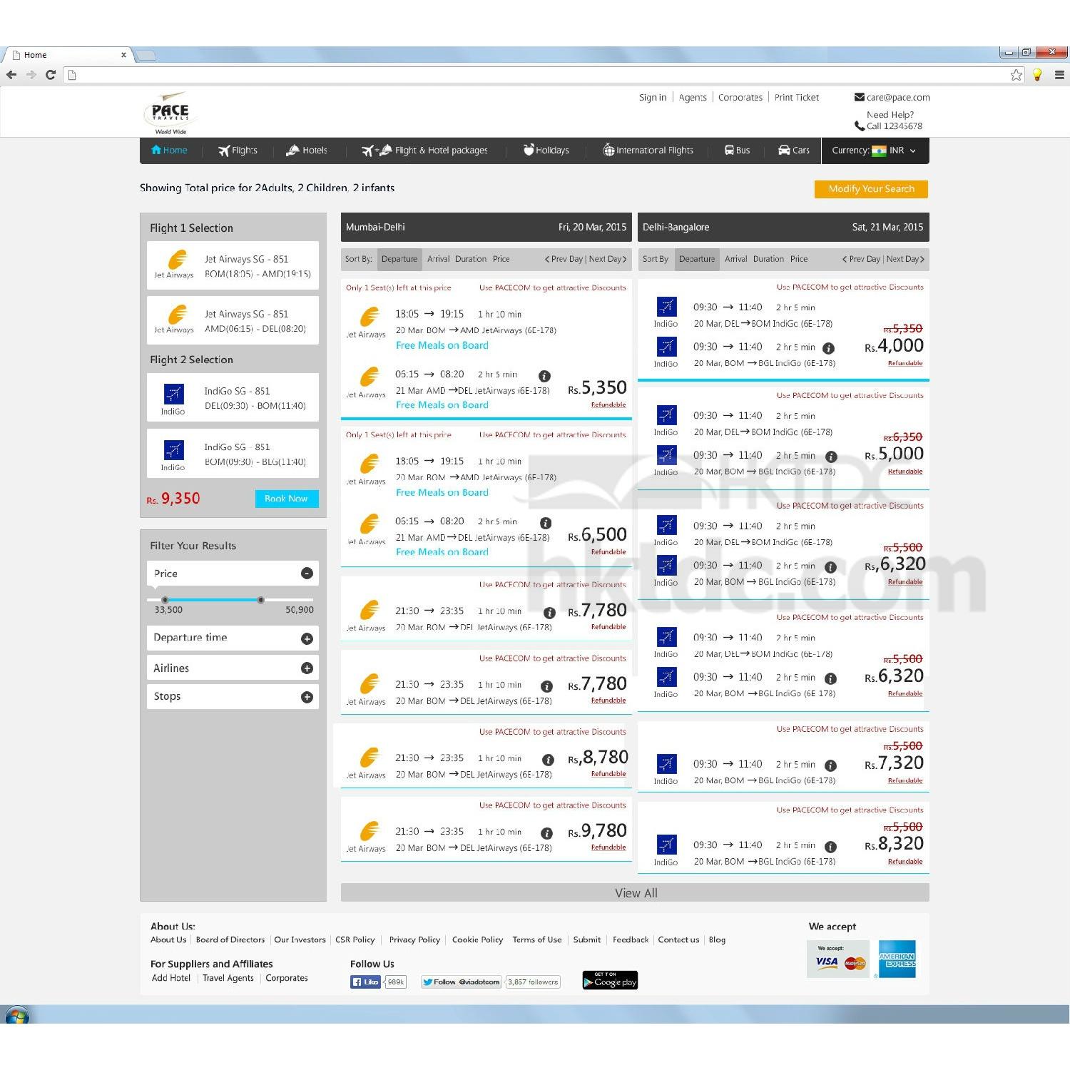 Easy interface for the one way and roundtrip and multi city flight booking. Basic filters: Price and Currency.