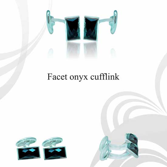 Showcased is a pair of rectangular-shaped cuff links made of onyx. They feature a highly polished surface with multiple facets. This pair of cuff links adds a decorative touch to your shirts.