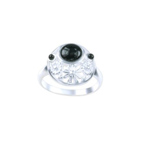 This onyx ring features a top round plate embellished with graceful blossoms for a natural touch. The round black onyx stones radiate a mysterious style. The band is nicely finished for shiny appearance.
