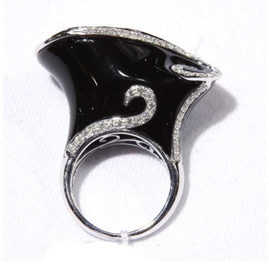 This pictured ring features fine construction of diamond, onyx and 18k gold. The ring captures attention with its volume and shimmer. This gigantic ring makes a bold fashion statement.