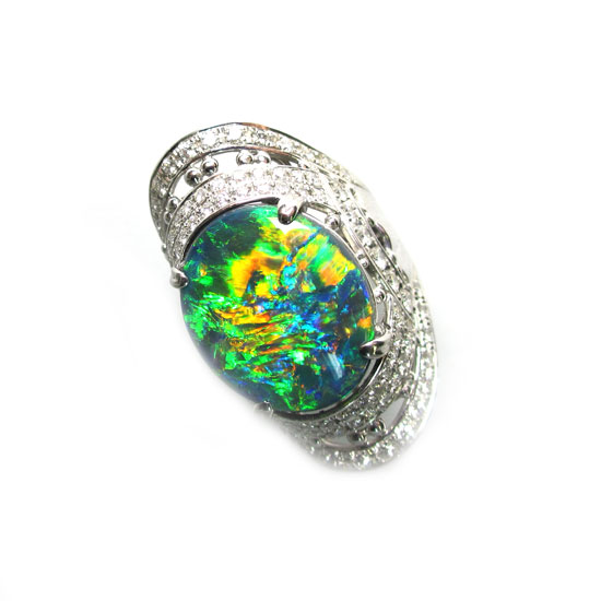 This bold finger ring features an oval-shaped black opal. The opal stone exhibits bright greenish flashes and looks even more beautiful with diamond accents. This finger ring is a great piece to adorn your slender finger.