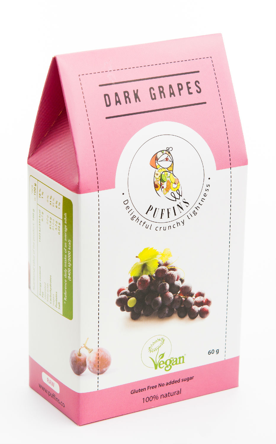 Crunchy organic dried dark grapes snack. Gluten free and vegan.