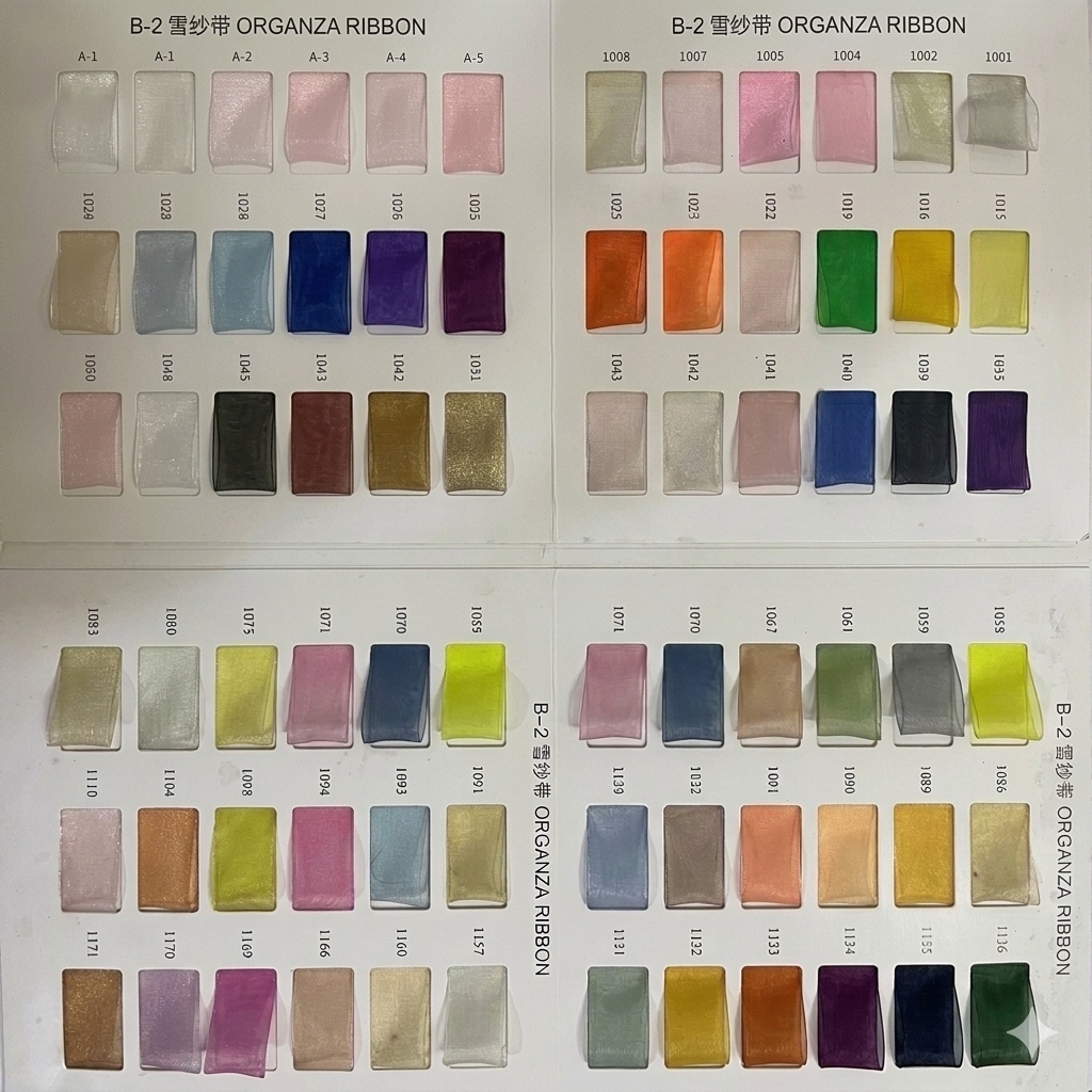 Our organza ribbon (sheer ribbon) is a lightweight, translucent ribbon made from high-quality polyester. Its delicate and elegant appearance adds a touch of sophistication to any gift or decoration.