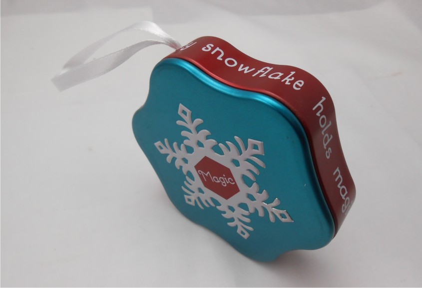 Metal box in shape of snowflake. Box close seamlessly with the elegant wave outline. Suitable for Candies and Chocolate beans, Small Pieces Products. Hanging with a ribbon loop for using as an ornament. Perfect packing for Christmas products. Food safe standard. In-house molding available for buyer. Welcome for OEM order with client's own design. Good Quality . Good Price . Fast Delivery.