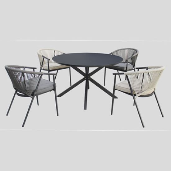Dining set steel frame with powder coating With 5mm Ropes weaving With Spun polyester seat cushion 5cm With 5mm black tempered glass top Chair size : 56*58*77 cm Table size : D120 cm