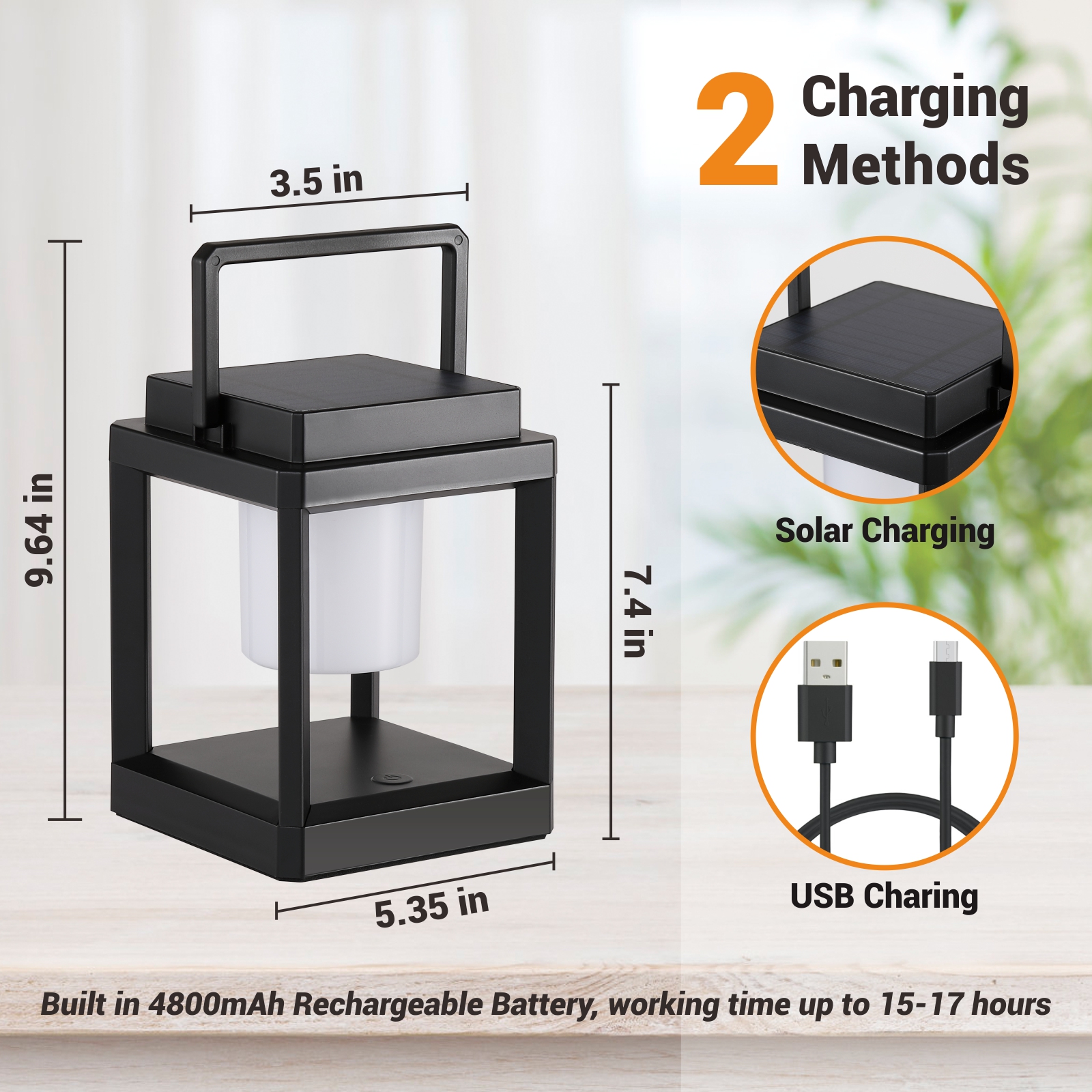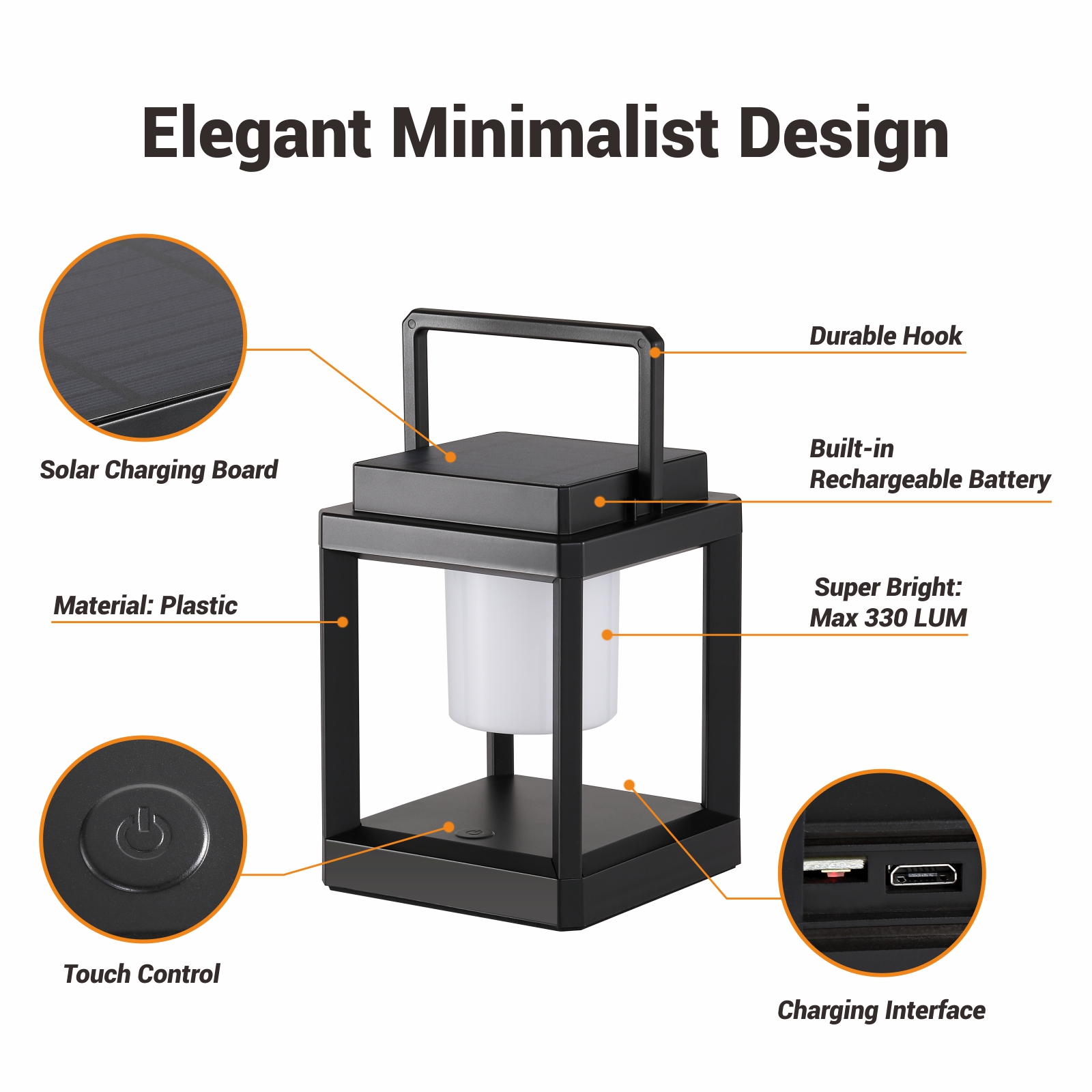 STTD | 1. Battery : Li-ion, 1200 mAh×4, rechargeable 2. Dimensions : L5.3"×W5.3"×H7.2" 3. Power : 35W 4. CCT : 3000K 5. Waterproof Rating : IP44 6. Meterial : PC + ABS 7. Color : matt black 8. Charge Time : 8-12 hours 9. Working Time : 5-6 hours in brightest mode, 15-17 hours in middle light mode, 60-70 hours in low light mode 10. Charging Type : Micro USB / Solar | Dimmable 40 Lumen 240 Lumen 330 Lumen | 1×Portable Lamp 1×Micro USB Cable 1×User Manual | 12pcs/ctn MOQ 10 cartons (120 pcs) |