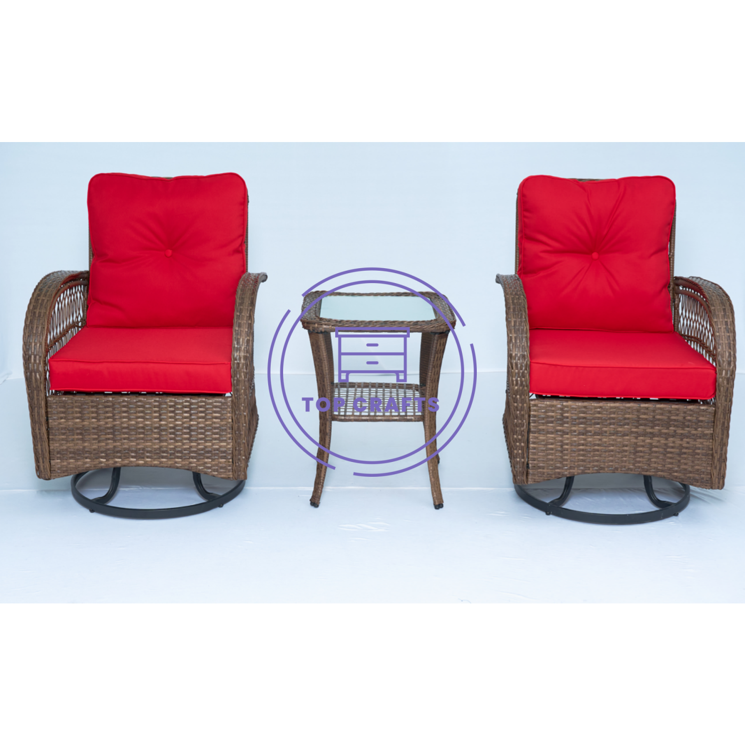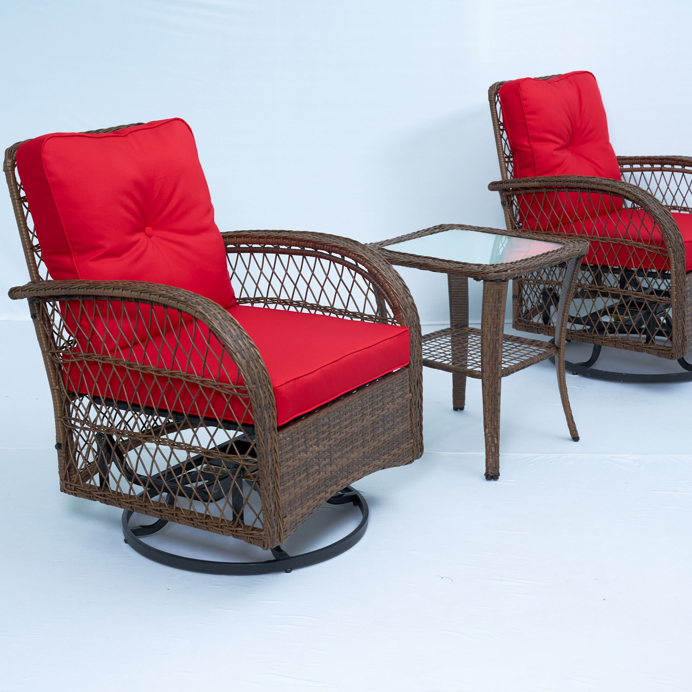 Good craftsmanship wicker set. The chair can swivel 360 degrees and glide back and forth. It is mixed with the flat and round resin wicker weaving for this decent design. Water resistant fabric cushion.