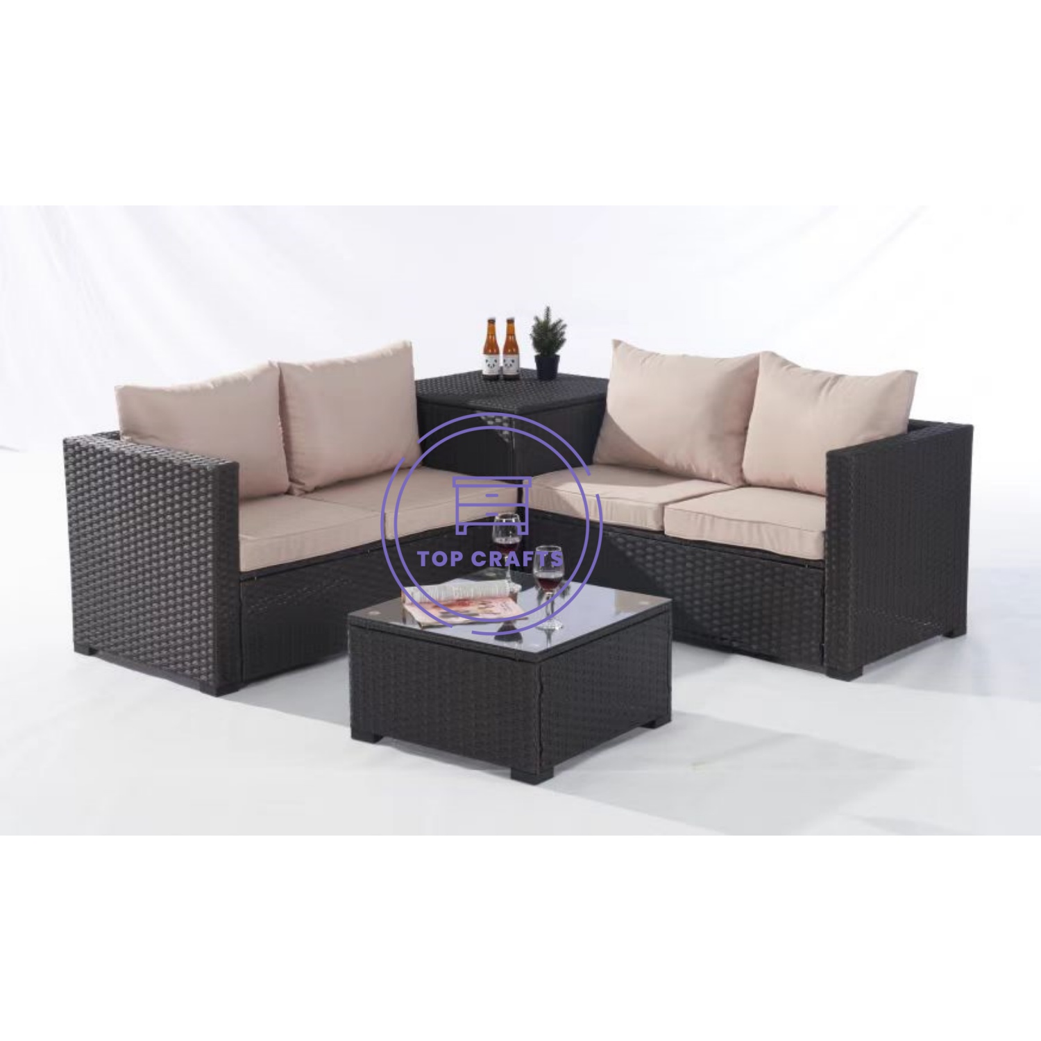 4 PCS SECTIONAL SOFA SET WITH STORAGE BOX. THE CUSHIONS CAN BE STORED INTO THE BOX AFTER USAGE. KD DESIGN. EACH SET INTO 2 CARTONS. 145 SETS/ 40HQ.