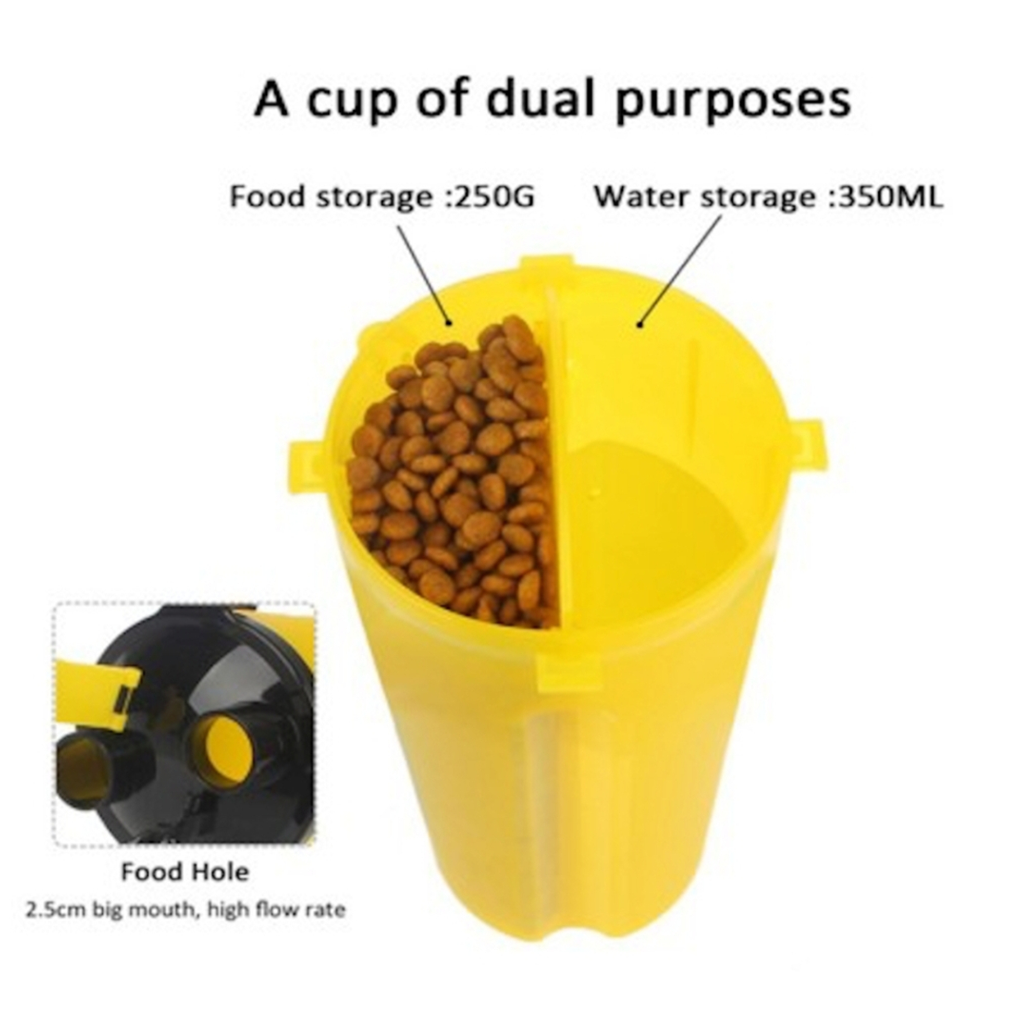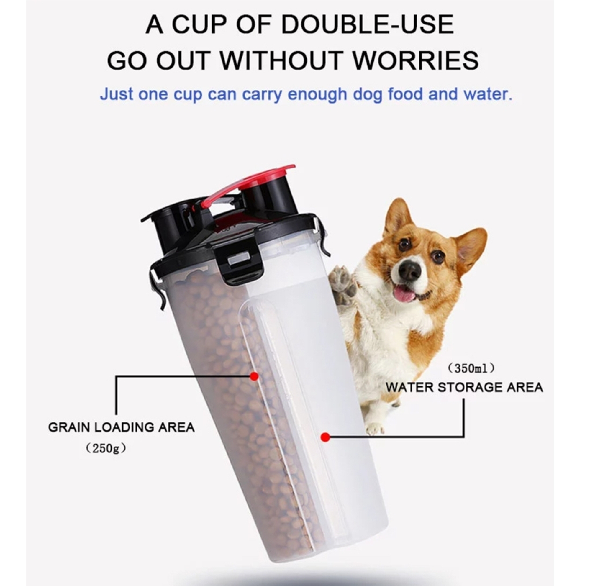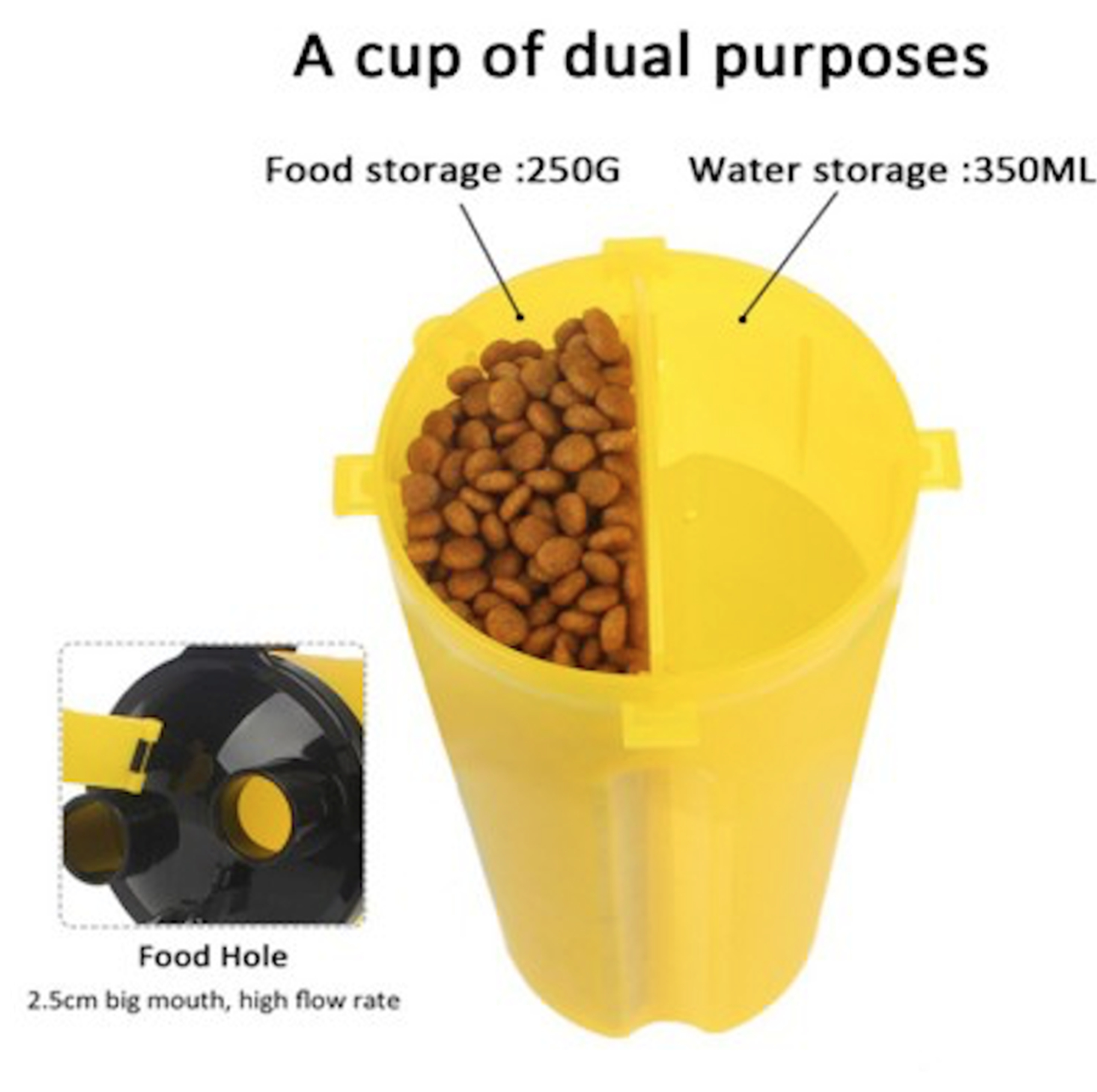 2 in 1 portable dog mug food containerA cup of double-useGo out without worriesFood storage: 250gWater storage: 350MLSize: 11*23*8cm or 4.33*9.05*3.14inch