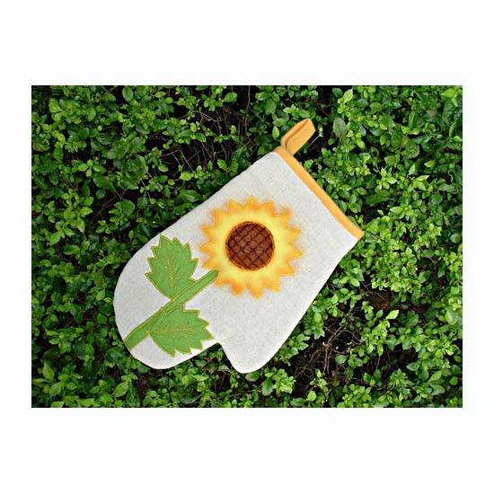 This beautiful oven mitt features a white construction with an adorable sunflower print on top. It comes with a loop on the trimming for hanging. Add this thick and functional oven mitt to your kitchen.