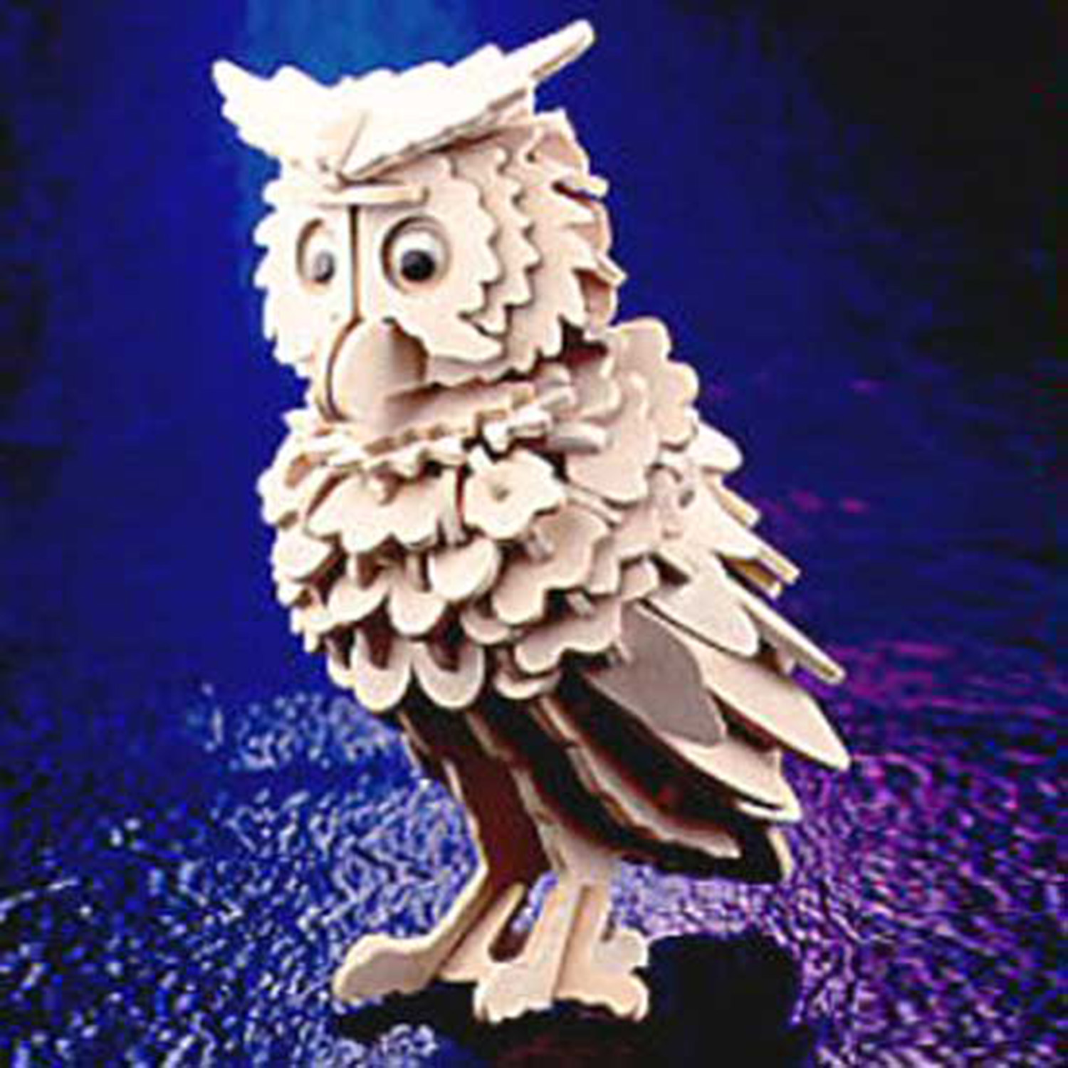 Pictured here is an owl model made from laminated wood with die-cut pieces. This wooden creature can be assembled easily without any tools or glue. This intricately crafted model is appealing to boys and girls.